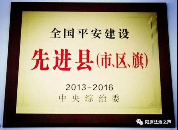 9月19日,全国社会治安综合治理表彰大会在北京举行,隆重表彰了全国社会治安综合治理先进集体、先进工作者、优秀市(地、州、盟)、全国平安建设先进县(市、区、旗)。阳原县再次蝉联2013——2016年度“全国平安建设先进县”,并荣获“长安杯”称号。这无疑为阳原县在新形势下砥砺奋进,跨越赶超,装备了更为强大的“稳定器”。 “长安杯”是中央综治委设立的全国社会治安综合治理工作的最高奖项和平安建设的最高荣誉,充分反映一个城市的社会治理和平安建设水平。须连续三届被评为“全国社会治安综合治理优秀市(平安建设先进县)”,才有资格参评,而“全国社会治安综合治理优秀市(平安建设先进县)”评选每4年开展一次,这意味着连续12年保持这一荣誉才能获得“长安杯”。